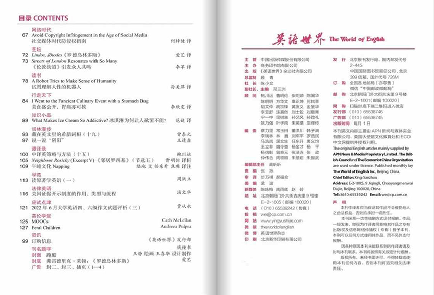 該雜志是一本以英語為主要語言的全球性雜志,涵蓋了廣泛的主題,包括文學、文化、歷史、教育、科技、商業等領域。這本雜志旨在為讀者提供深入了解英語國家和文化的機會,同時幫助讀者提高他們的英語水平。在該雜志中,讀者可以閱讀到豐富多彩的文章,包括名家作品、專題報道、獨家采訪等內容。通過閱讀這些文章,讀者不僅可以了解到英語國家的最新動態和文化風貌,還可以通過閱讀原版英文文章提升自己的英語閱讀和寫作能力。